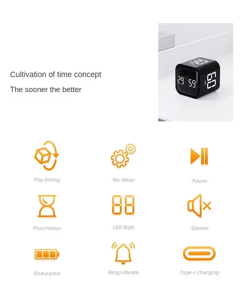 Boost your productivity with the Gravity Sensor Productivity Cube Timer. Featuring a sleek LED display and 4 preset times, this mini digital timer is perfect for cooking, studying, or any task that requires precise time management. Its unique gravity sensor allows you to flip it for easy mode switching, making it both functional and fun. Compact and versatile, this timer is a must-have tool to stay on track and make every minute count.